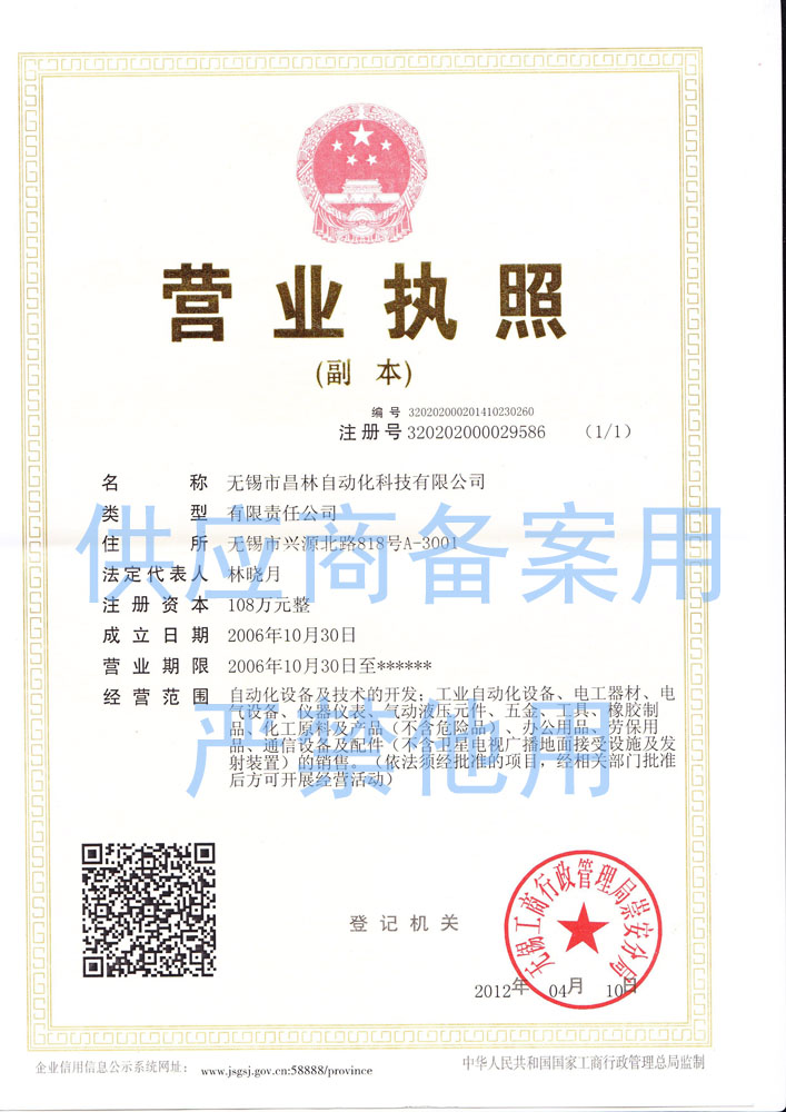 無錫市昌林自動化科技有限公司營業(yè)執(zhí)照副本