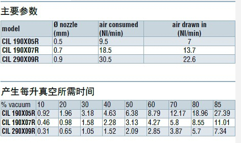 詳細(xì)信息 CIL190X05R,CIL190X07R,CIL290X09R,COVAL直線真空發(fā)生器 CIL系列有3種噴嘴直徑可供選擇(0.5,0.7和0.9mm),真空等級最高達(dá)90%。 主要參數(shù)見下表: