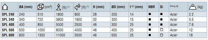 詳細信息 SPL240,SPL340,SPL400,SPL500,SPL600,COVAL重載吸盤 SPL系列重載吸盤,Ø240 - 600mm,材料:丁腈橡膠(NBR),硅膠(SI)。SPL系列重載吸盤適合用來處理重物,如金屬板或玻璃板,吸盤內(nèi)部的夾具使其水平搬運重物時不會彎曲變形,垂直搬運時可防止滑動。 主要參數(shù)見下表:
