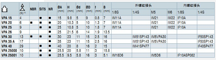詳細信息 VPA15,VPA20,VPA25,VPA26,VPA30,VPA35A,VPA40,VPA25000,VPA25001,COVAL紙張吸盤 VPA系列紙張吸盤,Ø15 - 25.5mm,材料:丁腈橡膠(NBR),半透明硅膠(SIT),天然橡膠(NR)。 主要參數(shù)見下表: