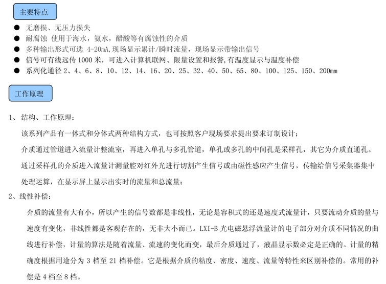 LXI-B光電磁懸浮流量?jī)x它的特點(diǎn)是無(wú)壓損、無(wú)磨損、靈敏度高、計(jì)量精確,最大的特點(diǎn)是量程寬。由于是無(wú)轉(zhuǎn)動(dòng)部分及流量遇有超出量程范圍多倍的情況出現(xiàn)也不會(huì)損壞流量計(jì)。無(wú)磨損、無(wú)壓力損失,故該型流量?jī)x特別適用于管徑大、流量小、壓力小
