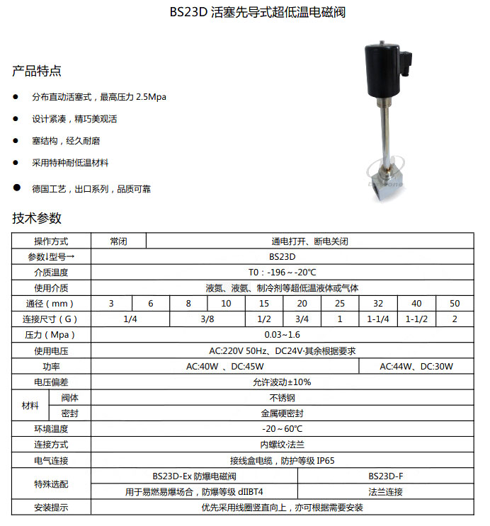 詳細信息 BS23D-DN3,BS23D-DN6,BS23D-DN8,BS23D-DN10,活塞先導式超低溫電磁閥