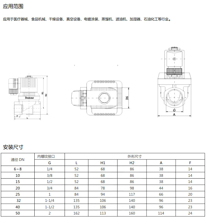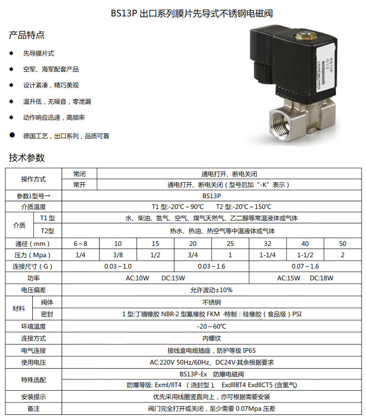 詳細信息 BS13P-DN6,BS13P-DN8,BS13P-DN10,BS13P-DN15,BS13P-DN20,膜片先導式不銹鋼電磁閥