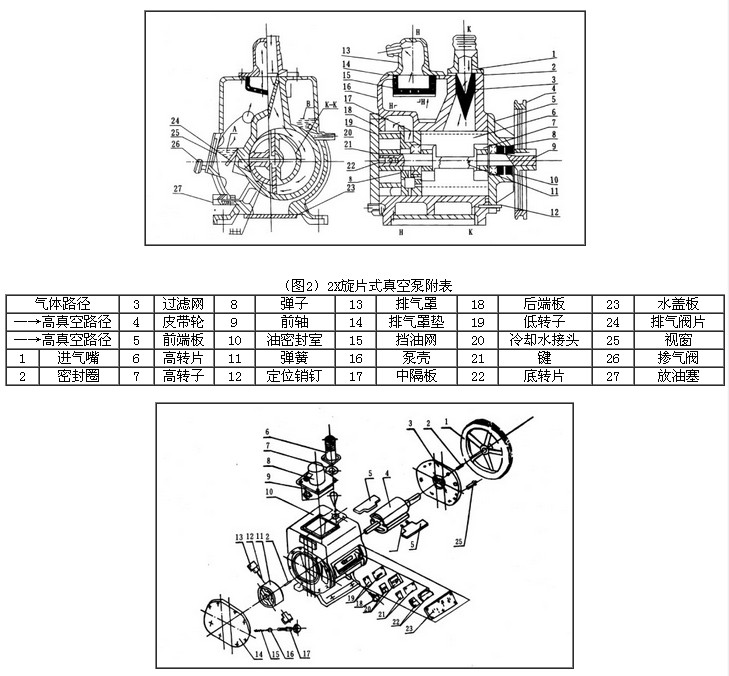 2X旋片式真空泵由泵體、高轉(zhuǎn)子、低轉(zhuǎn)子、前端板、后端板、高轉(zhuǎn)片、低轉(zhuǎn)片、排氣閥、排氣罩、視鏡等零部件組成。見(jiàn)圖2、圖3。