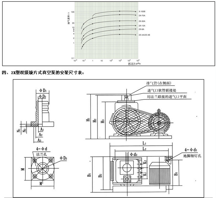 (4)2X旋片式真空泵型號(hào)表示方法:列2K—1,2代表雙級(jí)泵,K代表旋片式真空泵,一橫線后面的數(shù)字代表每秒鐘的抽速。