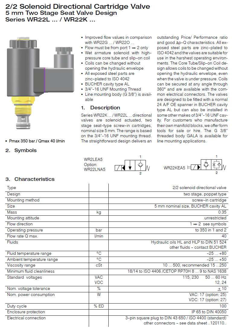 詳細信息 WR22LEA5-1,WR22KEA5-1,WR22LEA5V-1,WR22KEA5V-1,Bucher方向閥