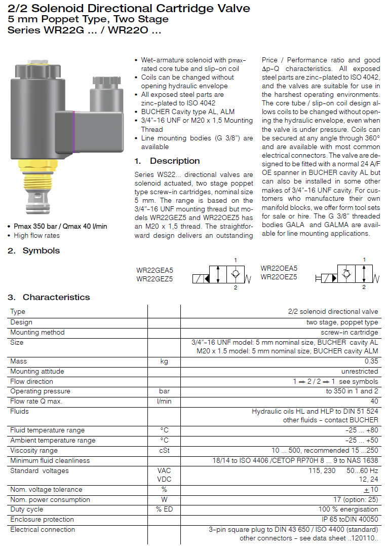 詳細(xì)信息 WR22GEA5-1,WR22OEA5-1,WR22GEA5V-1,WR22OEA5V-1,Bucher方向閥