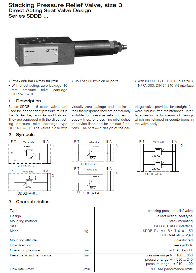 SDDB-A-6-SN,SDDB-P-6-SN,SDDB-B-6-SN,SDDB-T-6-SN,SDDB-AB-6-SN,Bucher卸壓閥