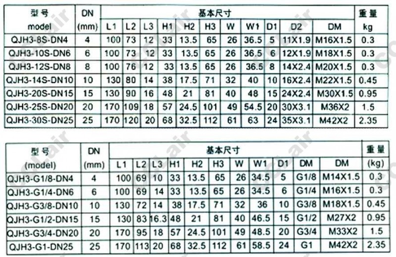 QJH3-8S-DN4,QJH3-10S-DN6,QJH3-12S-DN8,QJH3-14S-DN10,QJH3-20S-DN15,QJH3-25S-DN20,