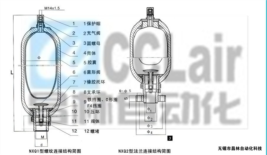 NXQ-蓄能器內(nèi)腔由皮囊分為兩個部分:囊內(nèi)裝氮?dú)?,囊外充液壓油。?dāng)液壓泵將液壓油壓入畜能器時,皮囊就受壓變形,氣體體積隨壓力增加而減少,液壓油被逐漸儲存。若液壓系統(tǒng)工作需要液壓油,則畜能器將液壓油排出,使系統(tǒng)的能量得到補(bǔ)償
