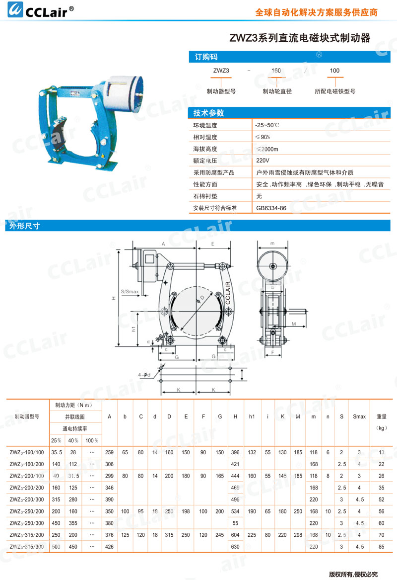ZWZ3-160,ZWZ3-200,ZWZ3-250,ZWZ3-315,ZWZ3-250/200,ZWZ3-315/300,ZWZ3-315/200,直流式電磁塊式制動(dòng)器