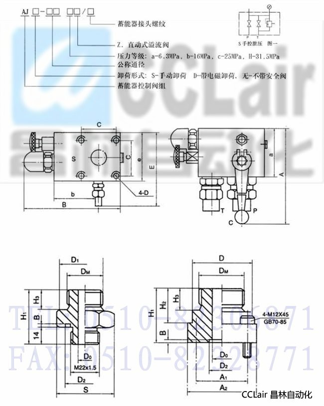 AJ型蓄能器控制閥組由球閥、安全閥和卸荷閥等組成,其中:安全閥有螺紋插裝式溢流閥,卸荷閥有手動控制(手動控制為螺紋針型閥)。
