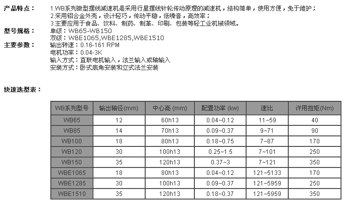 WB65,WB85,WB100,WB120,WB150,WB1065,WB1285,WB1510,WBE65,WBE85,WBE100,微型擺線減速機