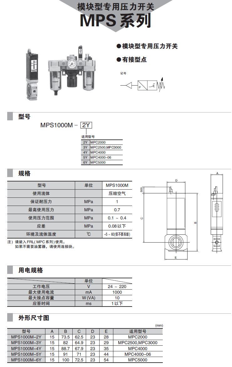 MPS1000M-2Y,MPS1000M-3Y,MPS1000M-4Y,MPS1000M-5Y,MPS1000M-6Y,模塊型專用壓力開關(guān)