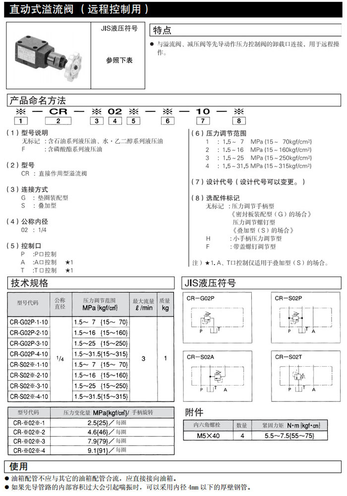 詳細信息 CR-G02P,CR-S02P,CR-S02A,CR-S02T,CR-G02P-1-10,CR-S02P-1-10,DAIKIN直動式溢流閥