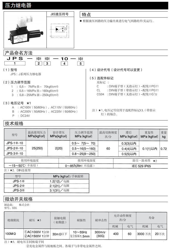 詳細(xì)信息 JPS-1A-10,JPS-1B-10,JPS-1P-10,JPS-2A-10,JPS-2B-10,JPS-2P-10,JPS-3A-10,JPS-3B-10,JPS-3P-10,DAIKIN壓力繼電器