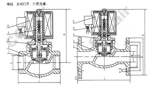 本閥為分步動(dòng)作直接先導(dǎo)式電磁閥,可根據(jù)斷電時(shí)所處開、關(guān)狀態(tài)的不同,可分為常閉式電磁閥和常開式電磁閥。常閉電磁閥,線圈通電后,銜鐵在電磁力作用下先帶動(dòng)副閥閥塞提起,主閥閥杯上的流體經(jīng)副閥流走,減少了作用在主閥閥杯上的壓力,當(dāng)主閥閥杯上的壓力減少到一定值時(shí),銜鐵帶動(dòng)主閥閥杯,并利用壓差而使主閥閥杯啟,介質(zhì)流通。線圈斷電后,電磁力消失,銜鐵因自重下落復(fù)位。同時(shí)依靠介質(zhì)壓力,主副閥得以緊密關(guān)閉。常開電磁閥,線圈通電后由于吸力作用,動(dòng)鐵芯下移,把副閥閥塞壓下,副閥關(guān)閉,主閥閥杯內(nèi)壓力上升,當(dāng)壓力升到一定值時(shí),主閥閥杯的上下壓差一樣,由于電磁力作用,動(dòng)鐵芯失去主閥閥杯下,壓緊主閥閥座,閥門關(guān)閉。線圈斷電時(shí),電磁吸力為零,副閥閥塞和支鐵芯由于彈簧作用向上提起,副閥打開,主閥閥杯上的流體經(jīng)副閥流走,減少了作用在主閥閥杯上的壓力,當(dāng)主閥閥杯上的壓力減少到一定值時(shí),利用壓差把主閥閥杯推起,主閥打開,介質(zhì)流通。