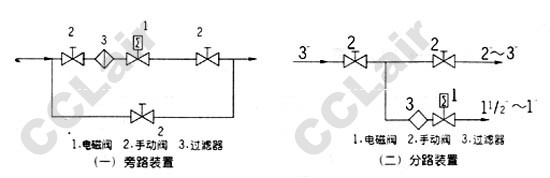 3、在電磁閥發(fā)生故障時(shí),為了及時(shí)隔離電磁閥,并保證系統(tǒng)正常運(yùn)行,最好安裝旁路裝置(如圖一)。