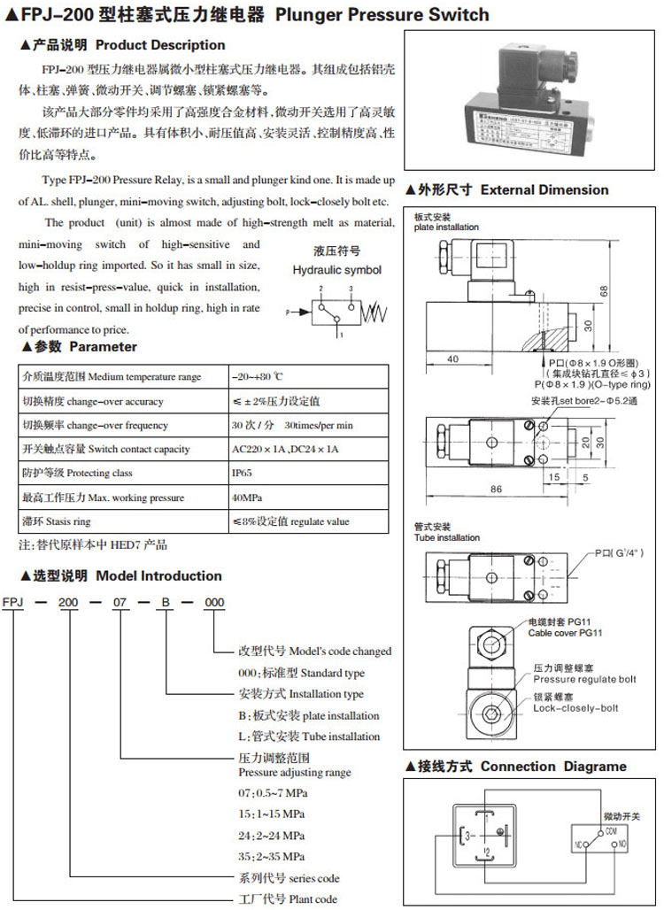 產(chǎn)品: 瀏覽次數(shù):653FPJ-200,柱塞式壓力繼電器