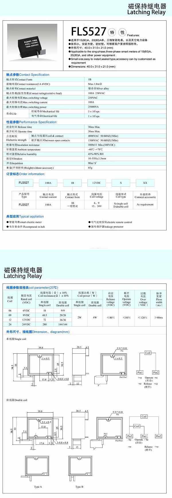 型號: FLS527-100A,磁保持繼電器