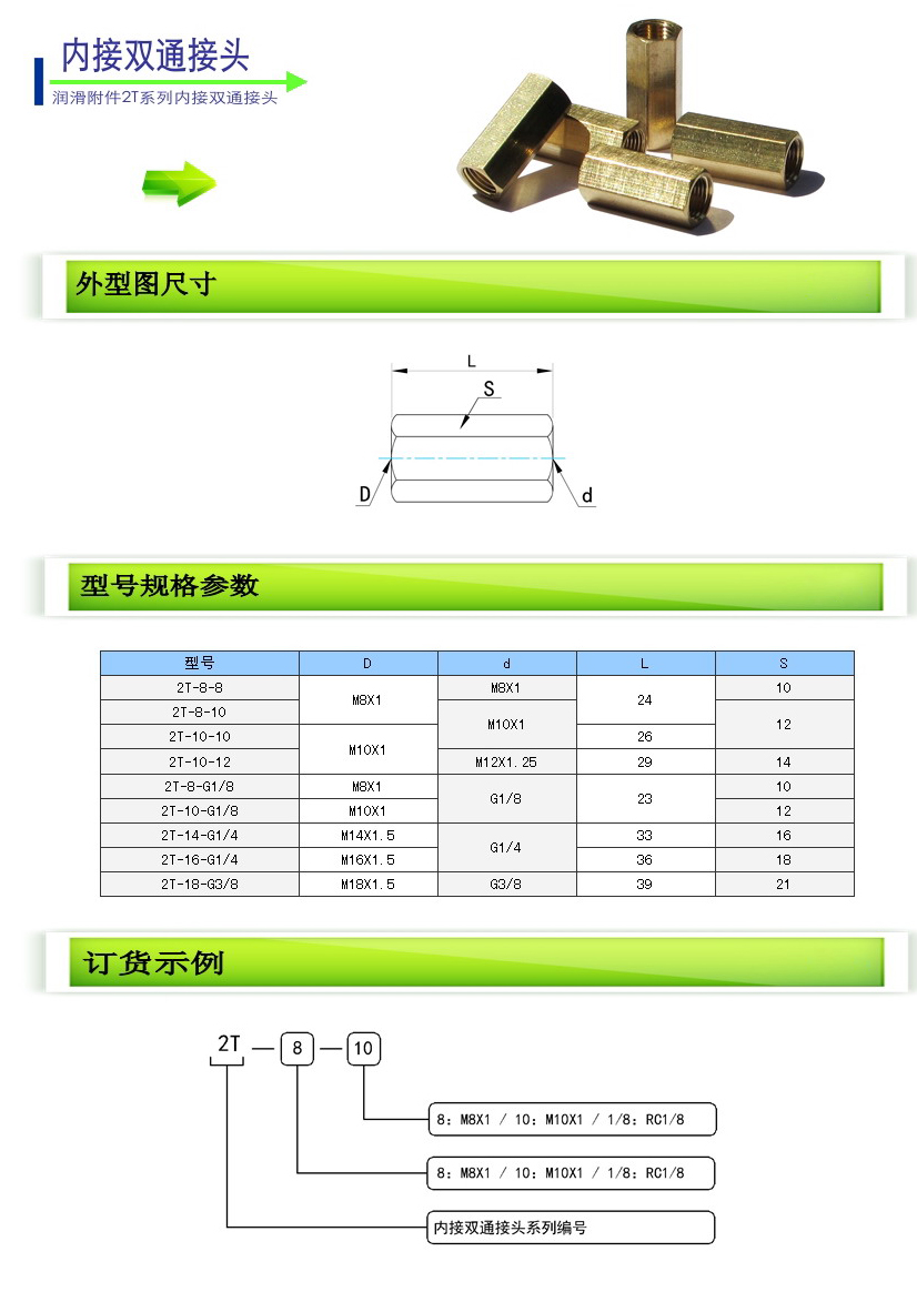 2T-8-8,2T-8-10,2T-10-10,2T-10-12,2T-8-G1/8,2T-10-G1/8,2T-14-G1/4,2T-16-G1/4,2T-18-G3/8,內(nèi)接雙通接頭