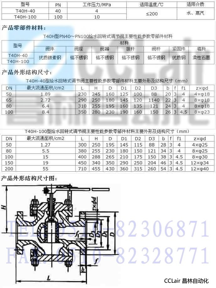 T40H-40、T40H-100 型給水回轉(zhuǎn)式調(diào)節(jié)閥:適用于中、低壓鍋爐給水管道和高壓加熱器疏水管上,通過(guò)轉(zhuǎn)動(dòng)圓筒形閥瓣使其與閥座形成的窗口面積改變,從而實(shí)現(xiàn)調(diào)節(jié)流量的目的。給水回轉(zhuǎn)式調(diào)節(jié)閥的回轉(zhuǎn)啟閉角度為 60°,由調(diào)節(jié)閥上方的開(kāi)度指示板來(lái)指示。可配用電動(dòng)執(zhí)行裝置,實(shí)行遠(yuǎn)程自動(dòng)化操作。