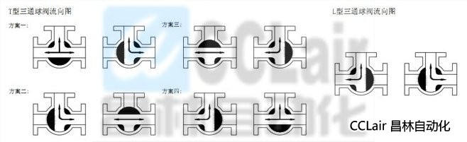三通球閥分L型和T型,介質(zhì)流通方向見下圖。L型三通球閥適用于介質(zhì)流向的切換,能使相互垂直的兩個(gè)通道連通:T型三通球閥適用于介質(zhì)的分流、合流或流向 切換,T型孔道可以使三個(gè)通道互相連通或使其中兩個(gè)通道連通,三通球閥一般采用兩個(gè)閥座結(jié)構(gòu),亦可根據(jù)用戶要求采用四閥座結(jié)構(gòu)。