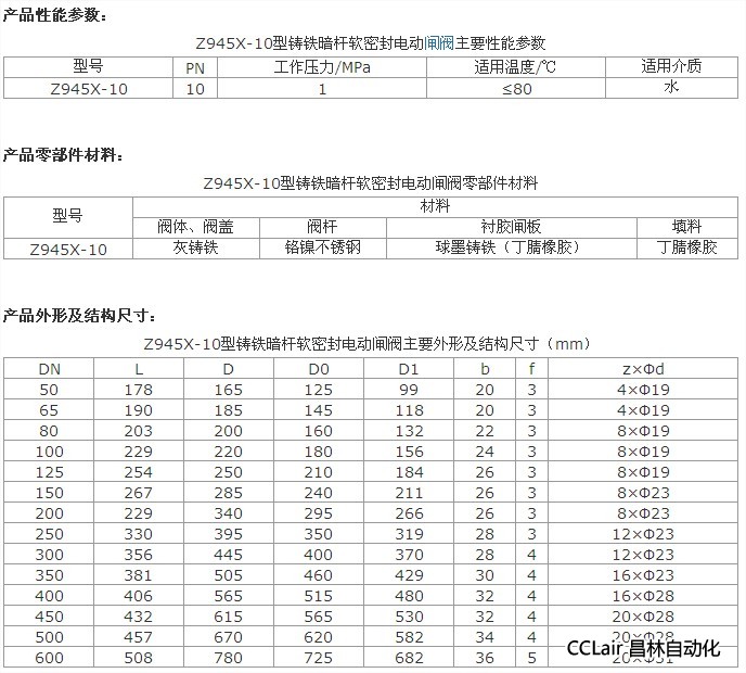 Z945X-10 型鑄鐵電動暗桿軟密封閘閥:電動、法蘭連接、暗桿楔式剛性單閘板,閥座密封面材料為丁腈橡膠,公稱壓力 PN10,閥體材料為灰鑄鐵的閘閥。