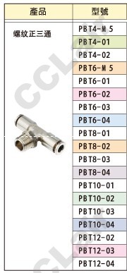 詳細信息 PBT4,PBT6,PBT8,PBT10,PBT12,PBT12-03,PBT10-04,PBT4-M5,PBT6-01,國鷹KUOIN螺紋正三通接頭