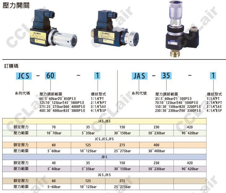JCS-60,JCS-125,JCS-275,JCS-400,JAS-35,JAS-70,JAS-150,JAS-230,JCS-60-4,國鷹KUOIN壓力開關(guān)