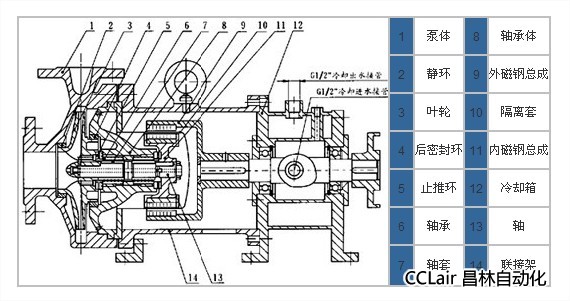 CQB-G型高溫磁力驅(qū)動(dòng)泵(簡(jiǎn)稱高溫磁力泵)通常由電機(jī),磁力耦合器,水冷卻裝置和耐腐蝕離心泵四大部分組成,其主要特點(diǎn)是利用磁力耦合器傳遞動(dòng)力。當(dāng)電動(dòng)機(jī)帶動(dòng)磁力耦合器的外磁鋼旋轉(zhuǎn)時(shí),磁力線穿過(guò)間隙和隔離套,作用于內(nèi)磁鋼上,使泵轉(zhuǎn)子與電動(dòng)機(jī)同步旋轉(zhuǎn),無(wú)機(jī)械接觸地傳遞扭矩。在泵的動(dòng)力輸入端,由于液體被封閉在靜止的隔離套內(nèi),沒(méi)有動(dòng)密封因而無(wú)泄漏。磁力耦合器的磁性材料采用耐高溫型稀土永磁材料,能承受280度以下的高溫介質(zhì)而保持強(qiáng)大的磁力扭矩。在電機(jī)與磁力耦合器之間加裝了水冷卻裝置,防止泵送高溫介質(zhì)之熱量傳導(dǎo)至電機(jī),以保持電機(jī)的正常運(yùn)行,從而達(dá)到無(wú)泄漏輸送高溫介質(zhì)。