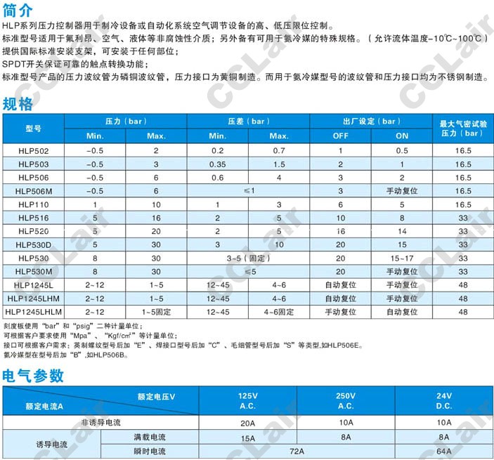 詳細信息 HLP502,HLP503,HLP506,HLP506M,HLP110,HLP516,HLP520,HLP530D,HLP530,HLP530M,HLP1245L,單壓控制器