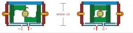 當(dāng)壓縮空氣從B孔進(jìn)入兩活塞外腔時,由于壓力作用,使兩活塞向中間合攏。 氣缸中腔的空氣通過A孔排出,同時中心軸便順時針方向旋轉(zhuǎn)90°,所對應(yīng)的閥門 也跟著順時針方向旋轉(zhuǎn)90°關(guān)閉。 |