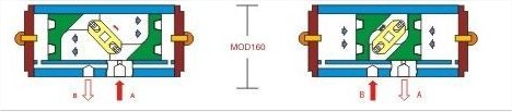 | 當(dāng)壓縮空氣從A孔進(jìn)入兩活塞之間的中腔時,由于壓力作用使兩活塞分離。 氣缸兩端氣腔的空氣通過B孔排出,同時中心軸便逆時針方向旋轉(zhuǎn)90°, 所對應(yīng)的閥門也跟著逆時針方向旋轉(zhuǎn)90°打開。 |
