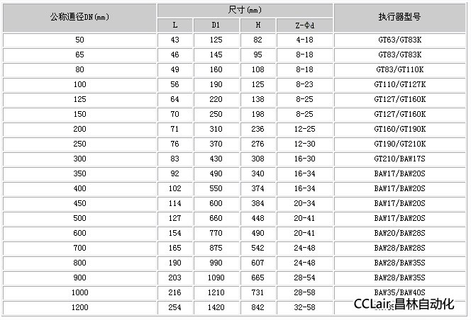 D673H氣動硬密封蝶閥主要尺寸及執(zhí)行器配置