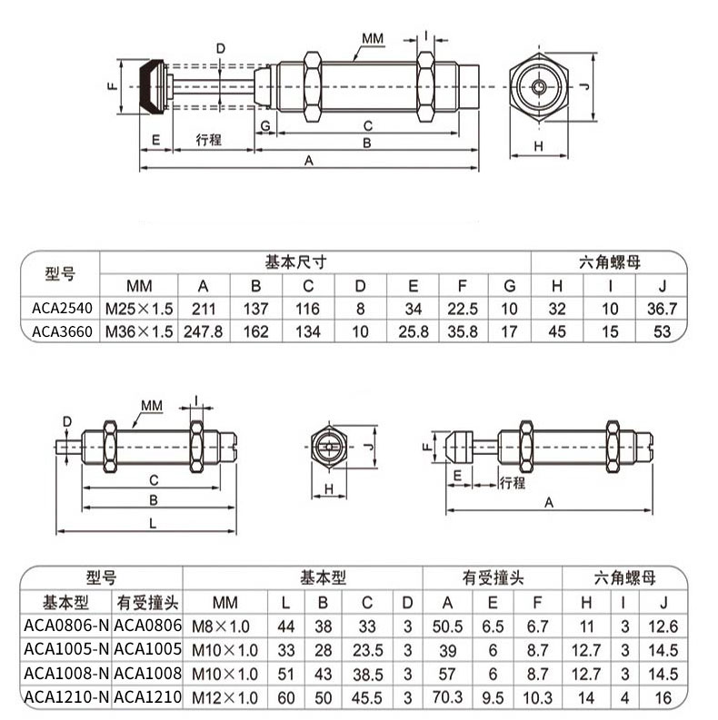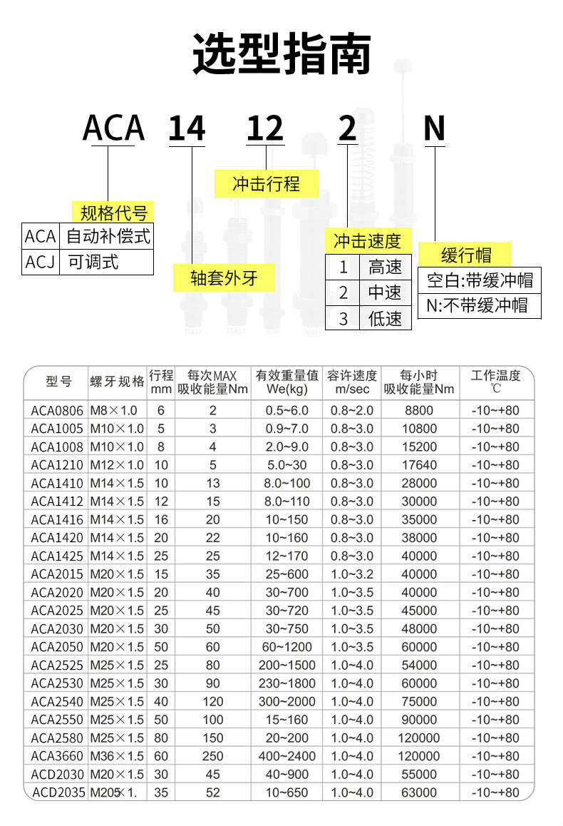 油壓緩沖器ACA0806,ACA1007,ACA1210,ACA1215,ACA1412,ACA1416,ACA1420,ACA1616,ACA1620,ACA1625,ACA2020,ACA2025,ACA2030,ACA2040,ACA2525,ACA2550,ACA2725,ACA2750,ACA3325,ACA3350,ACA3625,ACA3650氣缸阻尼器