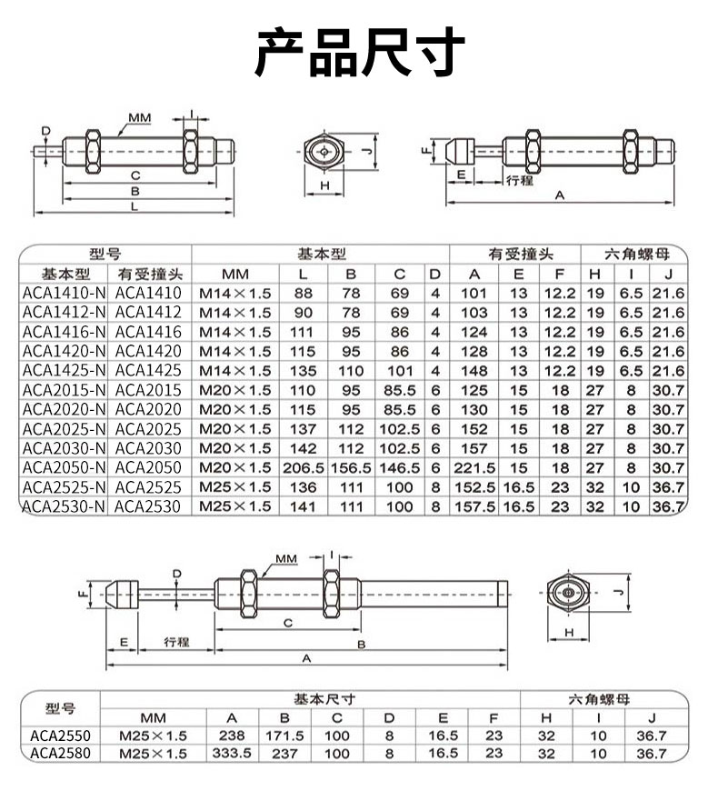 詳細信息 油壓緩沖器ACA0806,ACA1007,ACA1210,ACA1215,ACA1412,ACA1416,ACA1420,ACA1616,ACA1620,ACA1625,ACA2020,ACA2025,ACA2030,ACA2040,ACA2525,ACA2550,ACA2725,ACA2750,ACA3325,ACA3350,ACA3625,ACA3650氣缸阻尼器