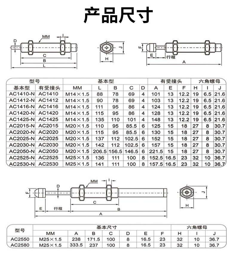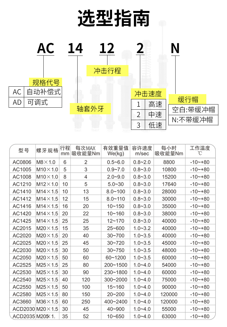 緩沖器油壓液壓AC0806-2,AC1005-2,AC1006-2,AC1007-2,AC1008-2,AC1210-2,AC1215-2,AC1412-2,AC1416-2,AC1425-2,AC1612-2,AC2015-2,AC2020-2,AC2030-2,AC2040-2,AC2050-2,AC2550-2,AC2580-2,AC2725-2,AC3650-2,AC3660-2氣缸阻尼器