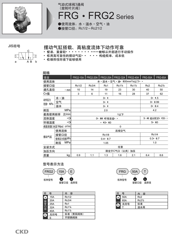 詳細信息 FRG2-15A,FRG2-20A,FRG2-25A,FRG2-32A,FRG2-40A,FRG-50A,FRG-65A,CKD氣動式球閥3通閥
