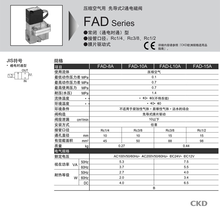 FAD-8A,FAD-10A,FAD-L10A,FAD-15A,FAD-8A-2CB-AC100V,FAD-8A-2C-AC100V,CKD先導(dǎo)式2通電磁閥