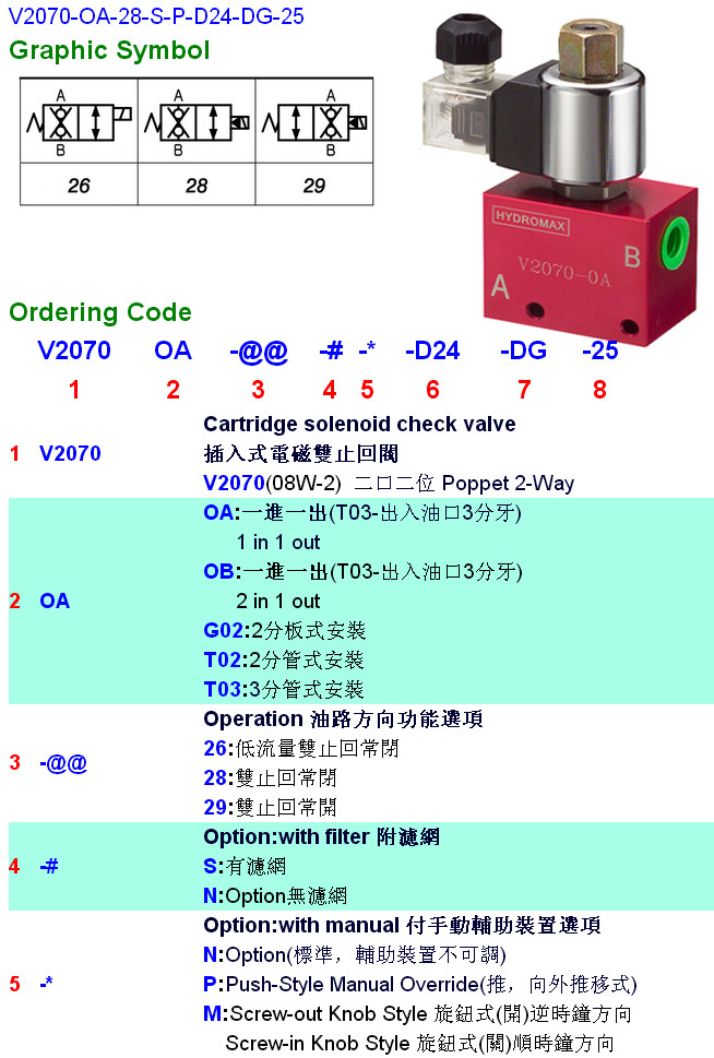 V2070-OA-28-S-P-D24-DG-25,V2070-OB,V2070-G02,V2070-T02,V2070-T03,HYDROMAX插入式電磁止回閥