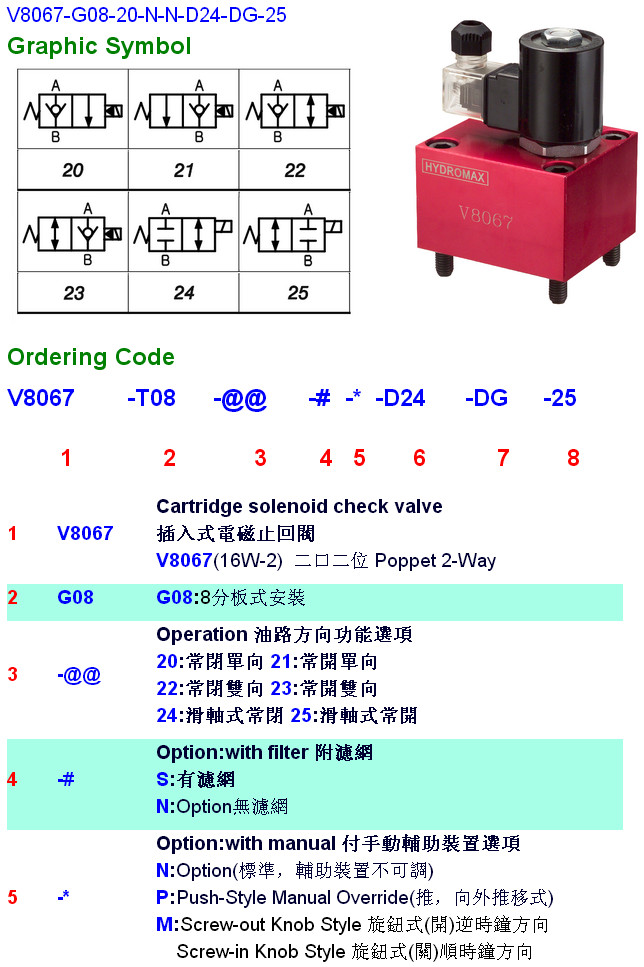 V8067-G08-21,V8067-G08-22,V8067-G08-23,V8067-G08-24,V8067-G08-20-N-N-D24-DG-25,HYDROMAX插入式電磁止回閥