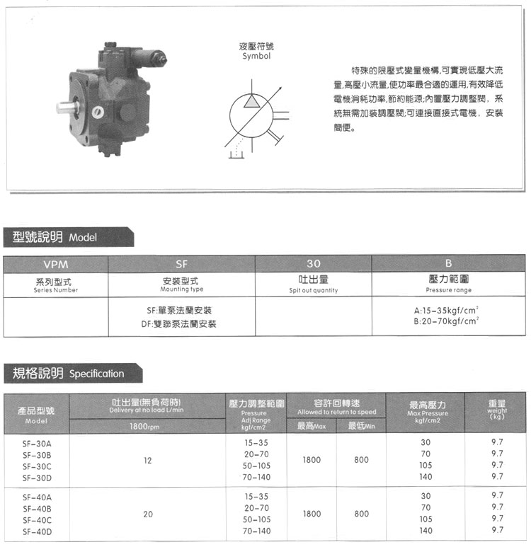 VPM-SF-30A,VPM-SF-30B,VPM-SF-30C,VPM-SF-30D,VPM-SF-40A,VPM-SF-40B,中壓可變?nèi)萘咳~片泵浦