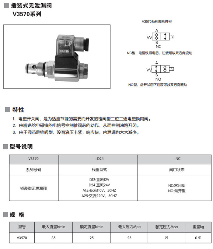 V3570-D24-NC,V3570-D24-NO,V3570-D12-NC,V3570-D12-NO,V3570-A15-NC,V3570-A15-NO,插裝式無泄漏閥