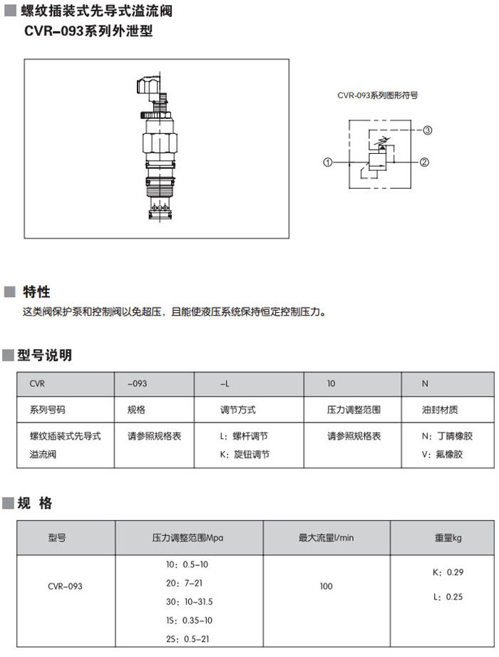 CVR-093-L10N,CVR-093-K10N,CVR-093-L20N,CVR-093-L30N,CVR-093-L1SN,CVR-093-L2SN,螺紋插裝式先導(dǎo)式溢流閥