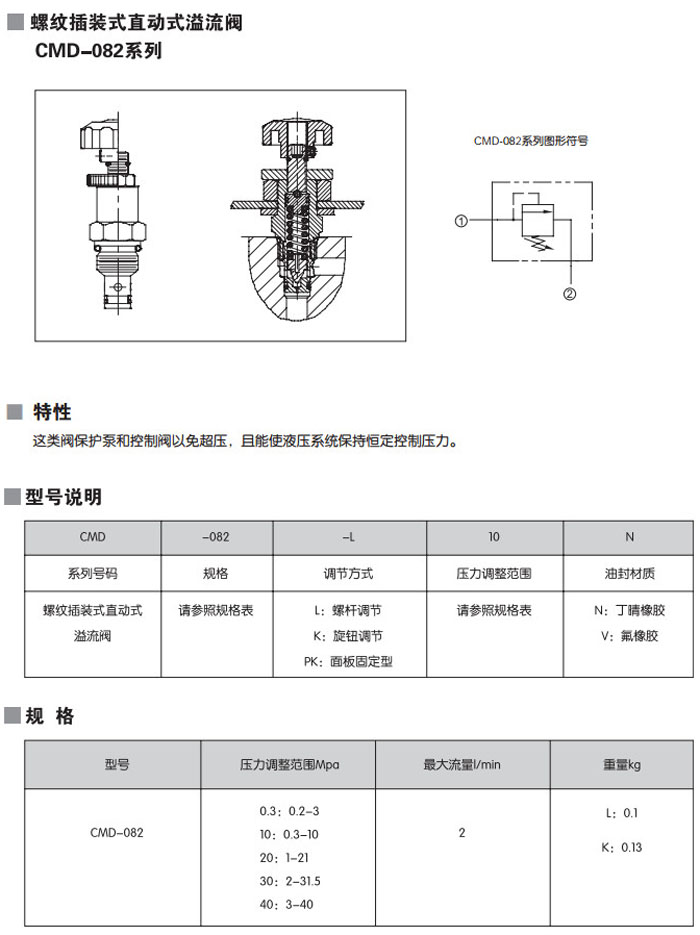 CMD-082-L0.3N,CMD-082-L10N,CMD-082-PK0.3N,CMD-082-L30N,CMD-082-K40N,螺紋插裝式直動式溢流閥