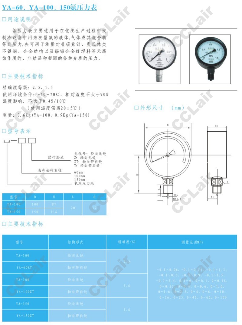 YA-60,YA-60ZT,YA-100,YA-100ZT,YA-150,YA-150ZT,氨壓力表,CCLair