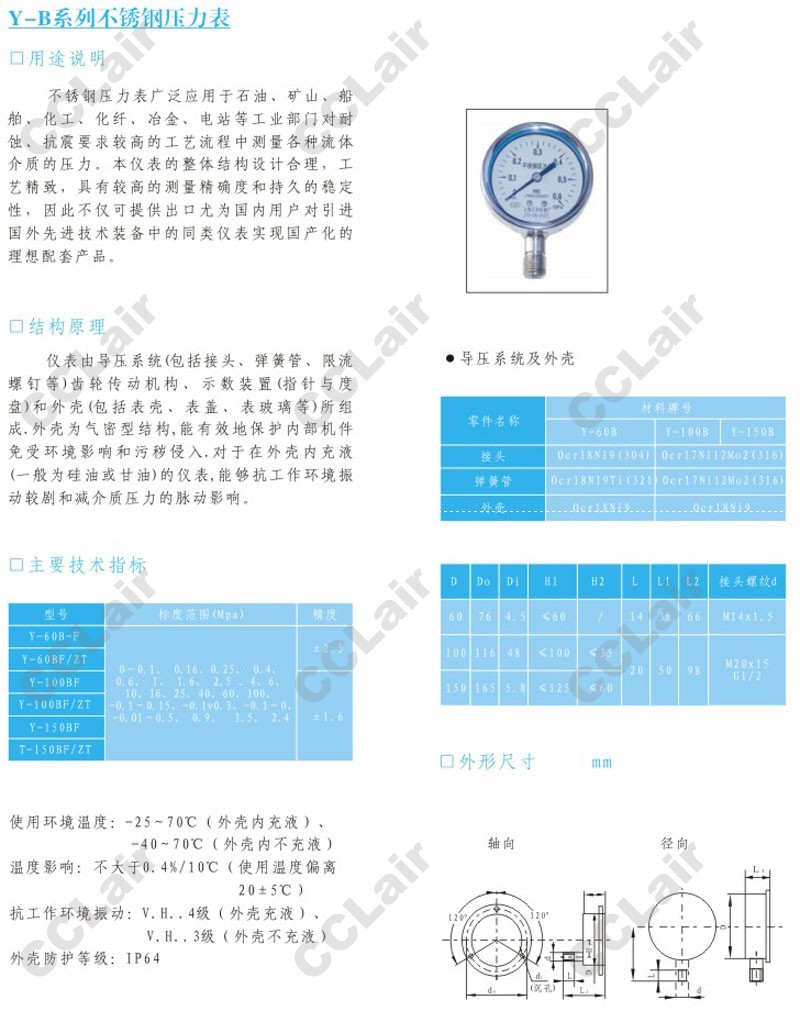 詳細信息 Y-60BF/ZT,Y-100BF,Y-100BF/ZT,Y-150BF,T-150BF/ZT,不銹鋼壓力表,CCLair