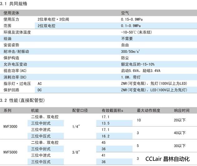 AC2100V~240V、介質(zhì)為經(jīng)過濾干燥的清潔空氣、工作壓力為0.15~0.9MPa。NVF3000、NVF5000系列電磁
