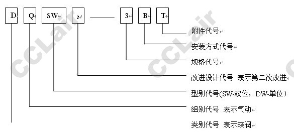 DQSW2 — 3BT表示經(jīng)第二次改進(jìn)的、帶氣源三聯(lián)件的、通徑為¢175的、水平安裝的氣動(dòng)雙位蝶閥。